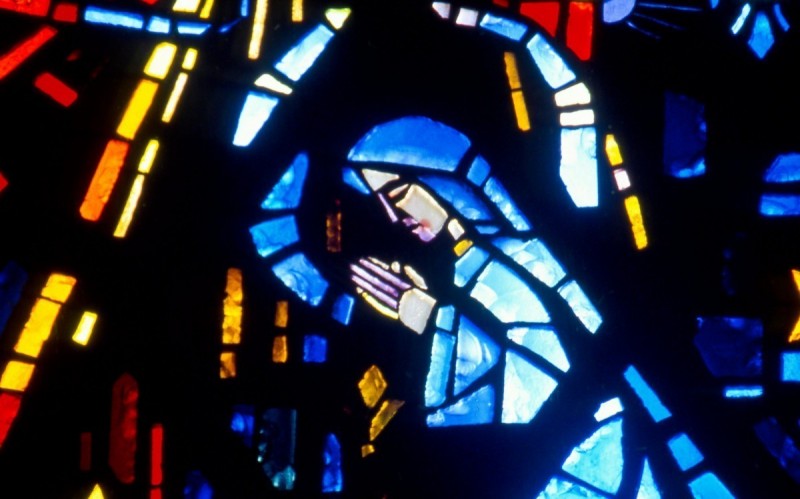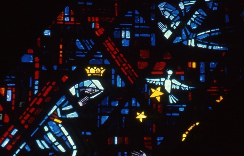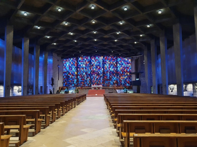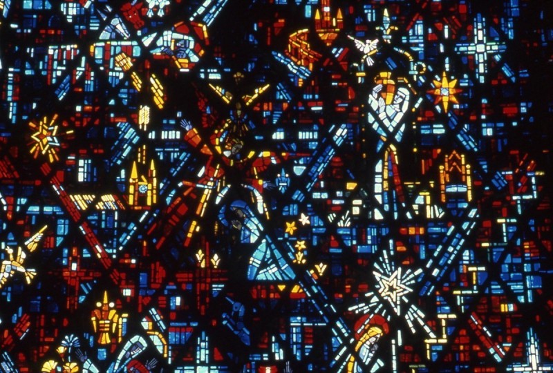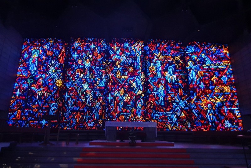 Grande "tapisserie" de verre du chœur sur le thème de la Vie de la Vierge : 20m de long sur 9m de hauteur en moyenne, 180 m², 396 panneaux