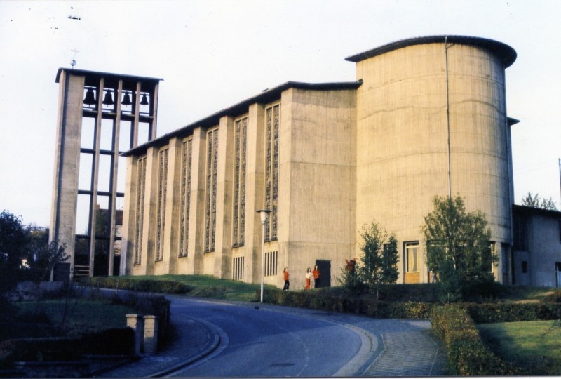 Dalles de verre et ciment, 1958, 13 baies "La vie du Christ" (n°1 : Généalogie du Christ, n°2 : Annonciation, n°3 : Nativité du Christ, n°4 : Baptême du Christ, n°5 : Miracle de Cana, n°6 : Portement de croix, n°7 : Résurrection, n°8 : Ascension, n°9 : Pentecôte, n°10 : Mission des Apôtres, n°11 : L'église avec Ste Barbara, n°12 : Jugement dernier, n°13 : Symbole du baptême), 197 m², Latz architecte, 2 livres dans le dossier "Dudweiler" 1971, Weidlich éditions 71 pages et "Dudweiler Akzente" Zeicmungen und Betrachtungen, 1984, 107 pages