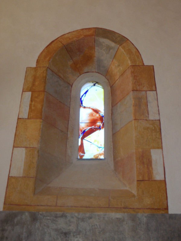 Clear glass painted with grisaille, enamel and cements, 2008, 7 bays (6bays : 35x120 cm et 1 bay : 70x144 cm), 3,52 m², followed by Bruno Loire,