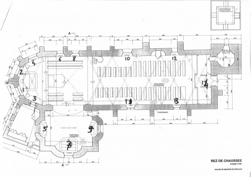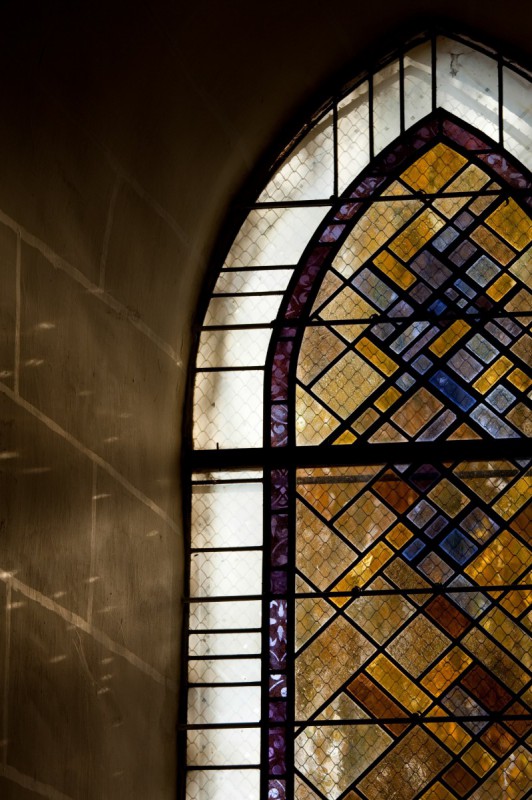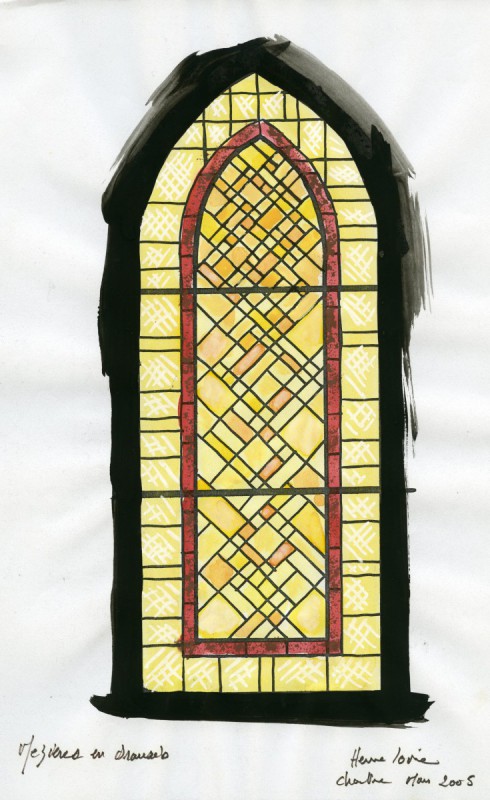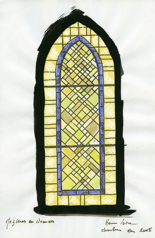 Antique glass settled by lead, 2006-2007, 6 windows (No. 6.8, 10, 11, 12 and 13) resumption of the motif of the choir windows to keep the aesthetic unity of the church, 12.34 m², François Sémichon architect 2 models in the folder, Catering for vandalism in 2006 the choir bays and bays west 17,40 m²