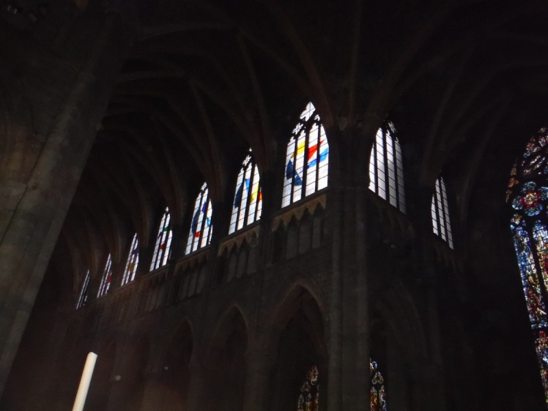 Verres antiques sertis de plomb, 2013 à 2014, 14 baies de la haute nef, 280 m² (343x727 cm chaque baie)