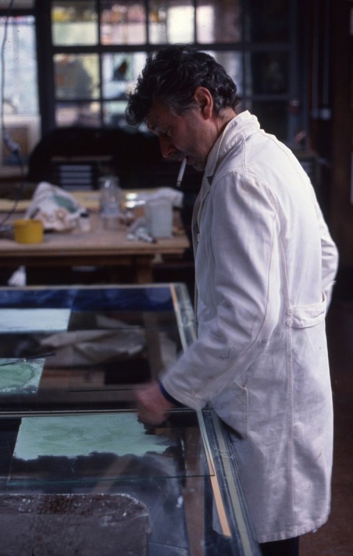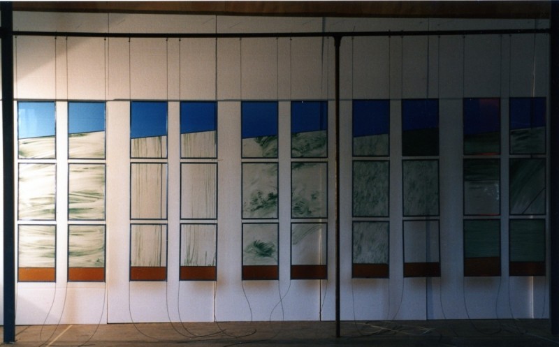 Verre antique de couleur et incolore peints à la grisaille verte, 1990, "Fenêtre" vitrail composé de 6 éléments de 58x38 cm, 5 ex signés et numérotés "Buraglio 90"