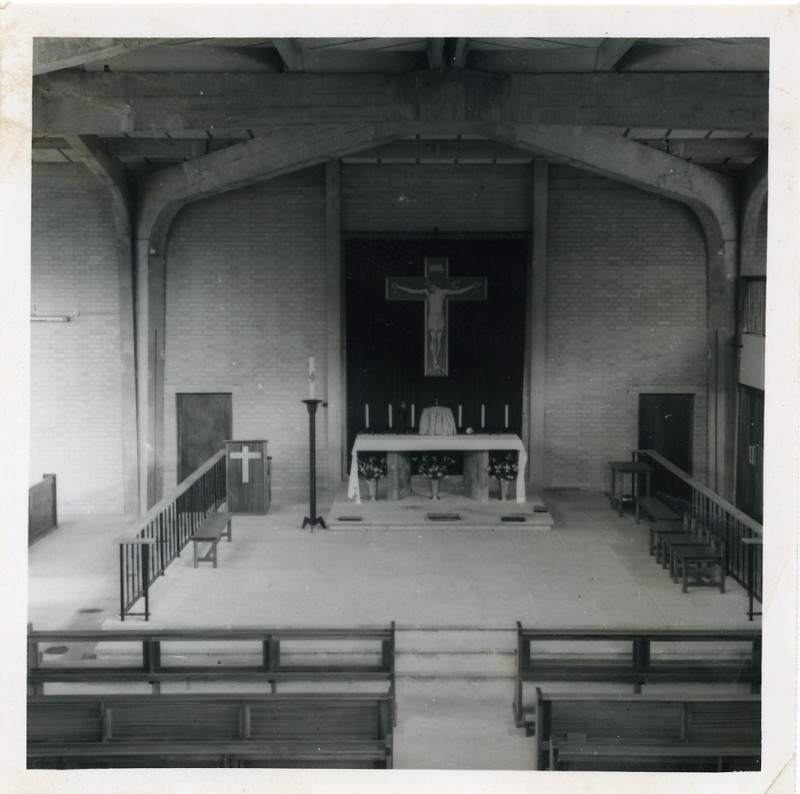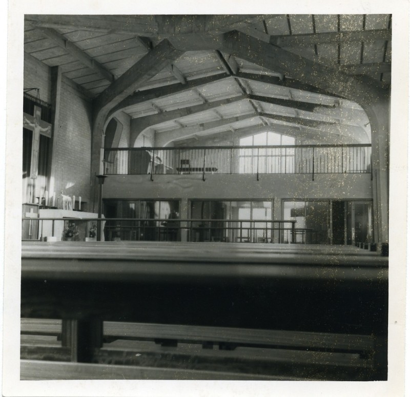 Dalles de verre et ciment, 1962 - 1963, 21 baies (voir plan de situation et description des vitraux), 124 m², toutes les maquettes sont en archives aux Ateliers Loire à Lèves