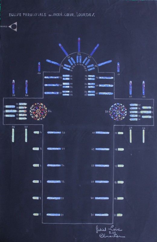 Dalles de verre, 1966 - 1985, 40 baies, 140 m² - plomb, 1966, 33 baies - 91 m², Toutes les maquettes en archive sauf baies n° : 1 à 4, 6, 11, 15 à 20, 29,30, 44, 45