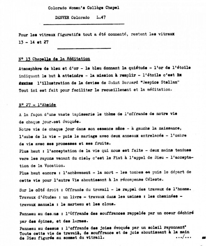 Dalles de verre et ciment, 1960 - 1962, 15 baies, 205 m², Stanley E. Morse architecte, 1 maquette dans le dossier, 27 maquettes en archives, en 9 planches, (baies n° 1 à 12, 15 à 26, meditation chapel, baie n° 1 côté nord)