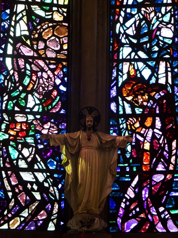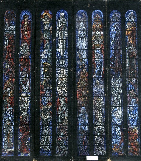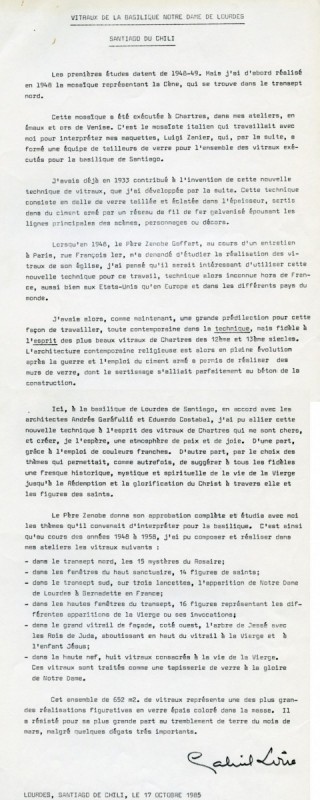 Dalles de verre et ciment, 1948 à 1960, 50 baies, 652 m², Andrés Garafulic et E. Costobal architectes, Restauration de certains panneaux en 1986 par Jacques Loire suite à un tremblement de terre, Mosaïque murale, 1948 et 1960, 22 m² dont "La Cène", Chemin de croix